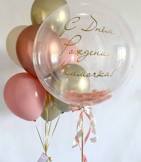 Шар баблс с розовыми перьями и индивидуальной надписью.