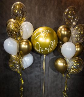 Два фонтана из 10 латексных воздушных шаров каждый. Золотой шар бабл с надписью.
