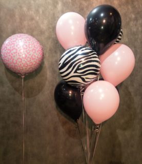 Фонтан из латексных и фольгированных воздушных шаров, принтом зебра и с принтом леопард.