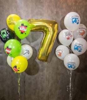 2 фонтана из латексных шаров с логотипом игровой тематики. Фольгированный шар — цифра 7.