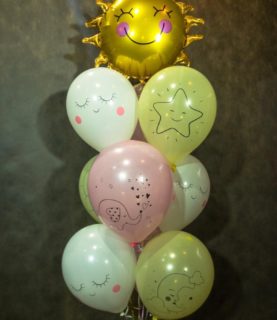 Солнечная композиция из принтованных воздушных шаров и фольгированного шара Солнце.