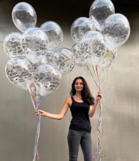 19 прозрачных воздушных шаров с надписями. Для дополнительного декора мы использовали разноцветные ленточки.