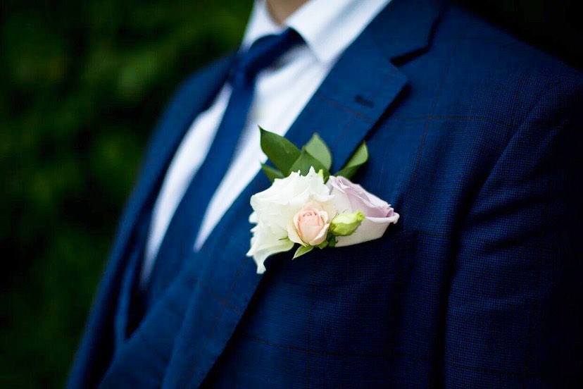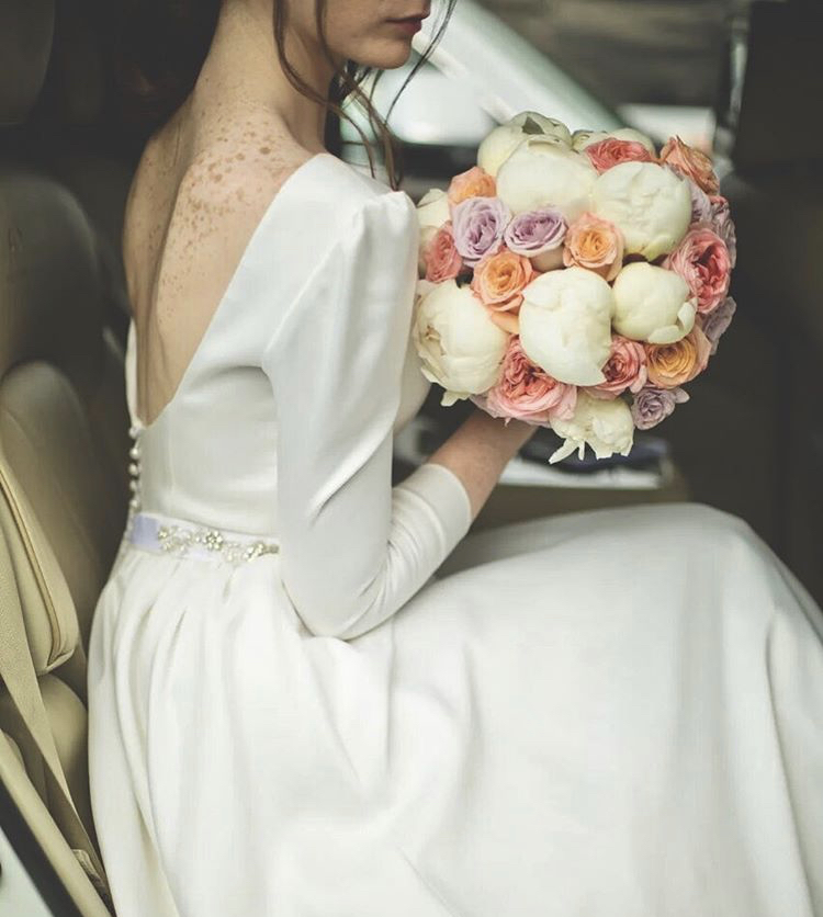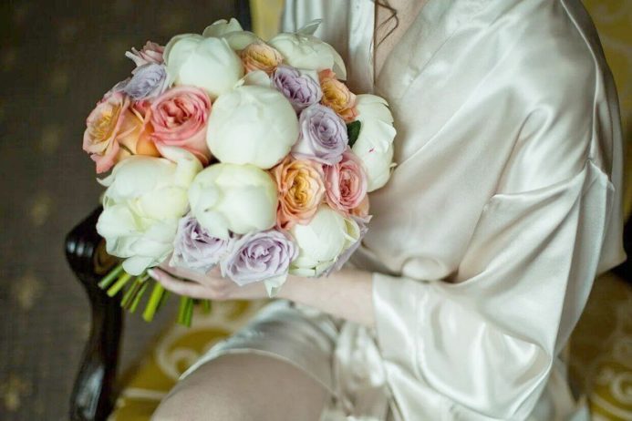 Букет невесты из белоснежных шариков пионов, лавандовой розы и нежнейших пионовидных роз. Бутоньерка в подарок.