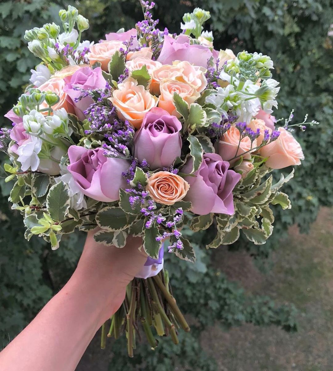 Букет невесты из белых пионов и лавандовых роз