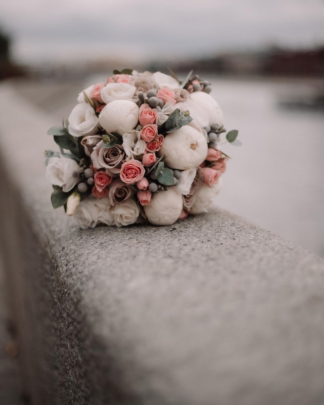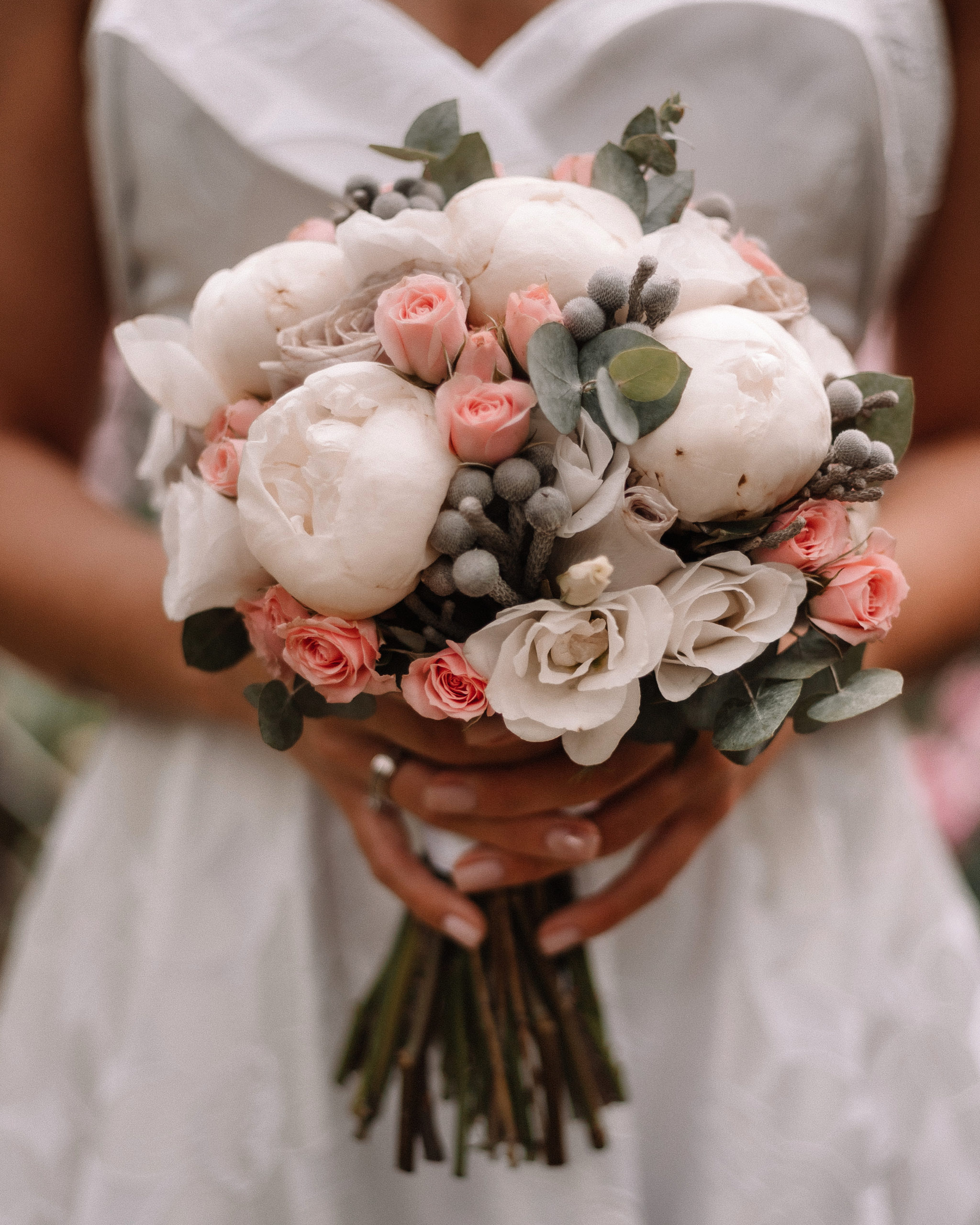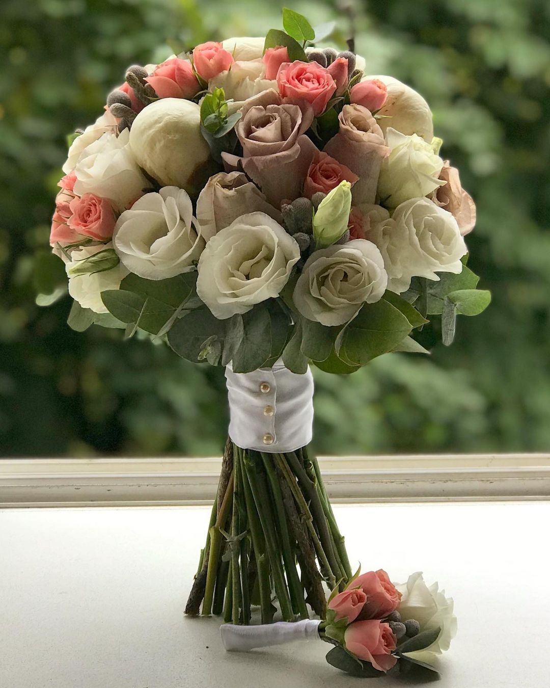 Белая эустома, Бруния, Кустовая роза Яна, Одноголовая роза Мента, Пион, Пион Дюшес, Роза, Эвкалипт