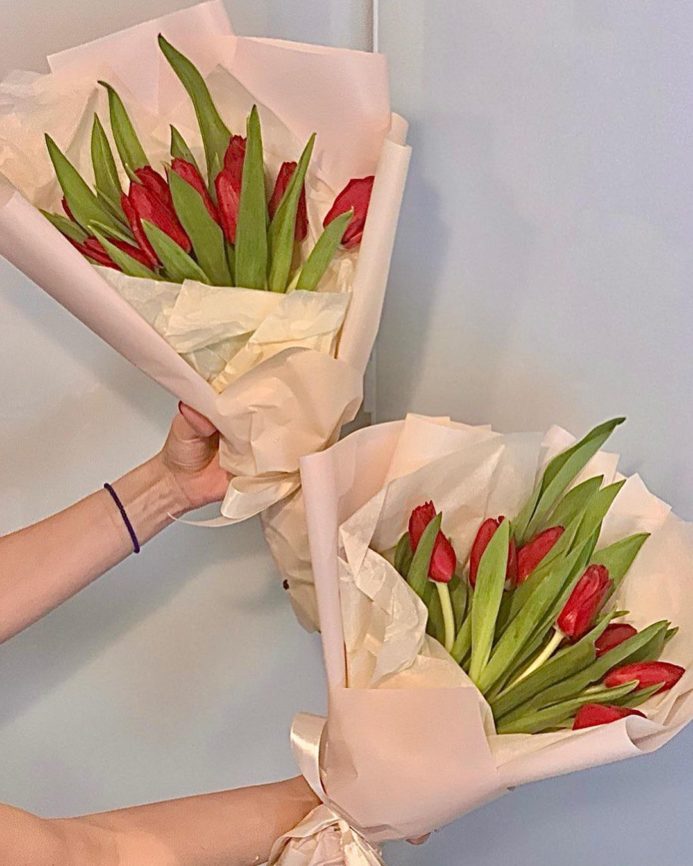 — питоспорум, букеты из 11 алых тюльпанов.