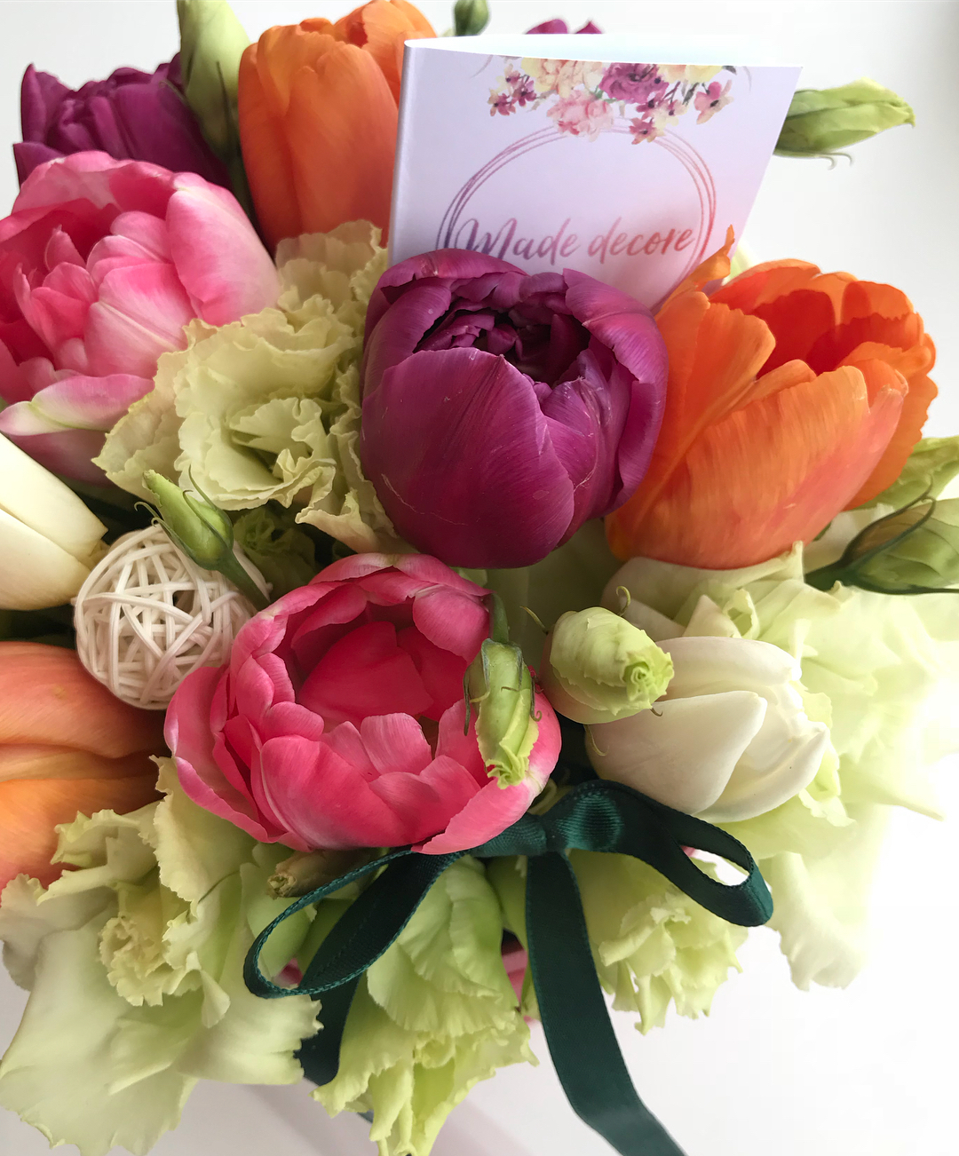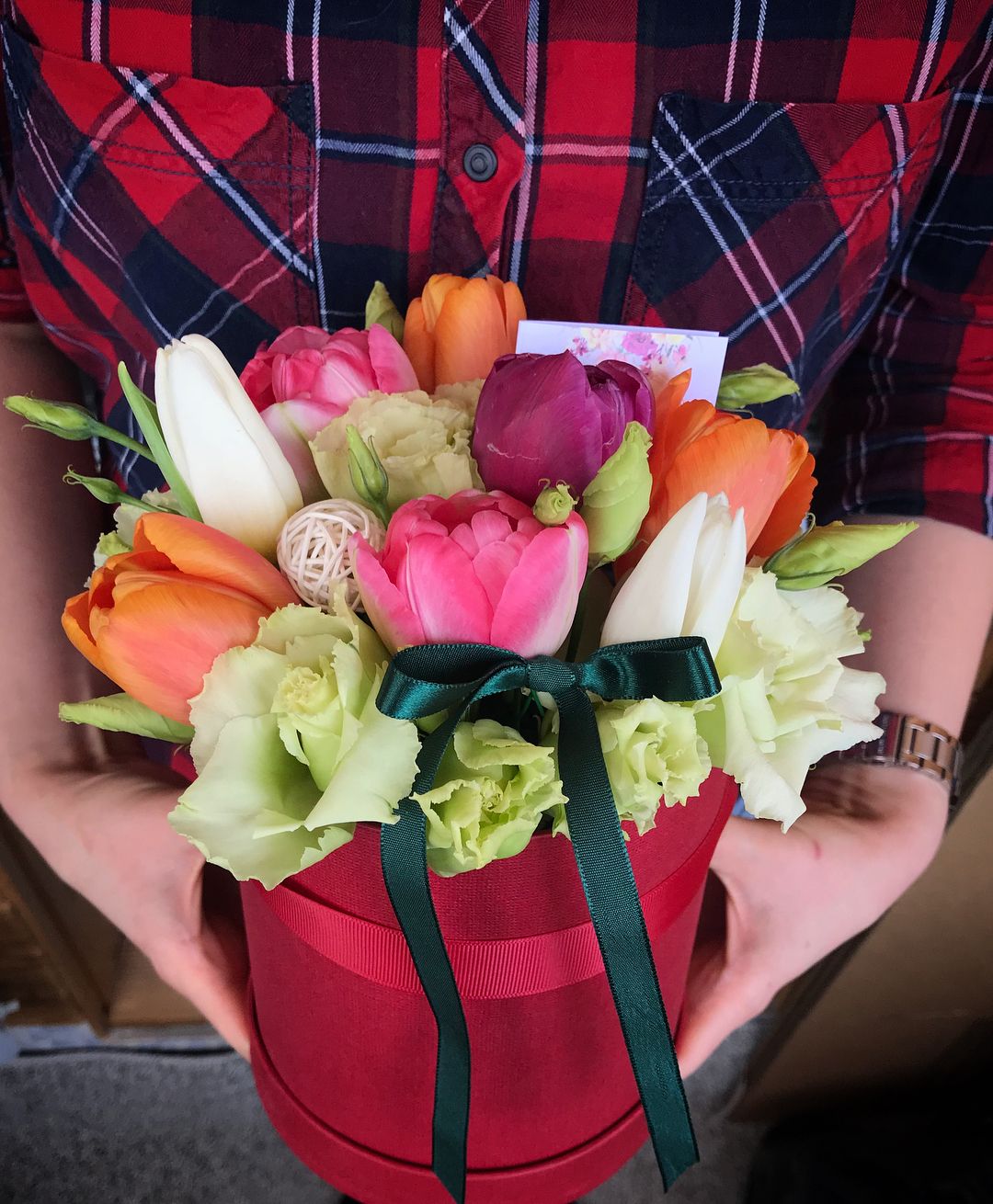 Мини шляпная коробка наполненная весенним настроением. Букет из тюльпанов разных цветов.
