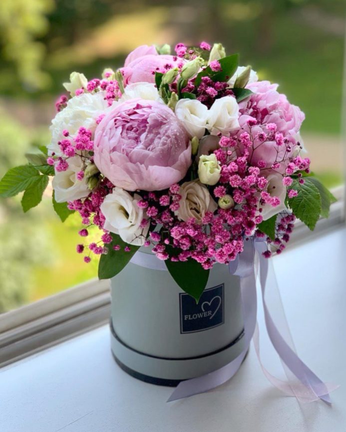 Белая эустома, Гипсофила, Малина, Пион, Пион Сара Бернар, Розовая гипсофила