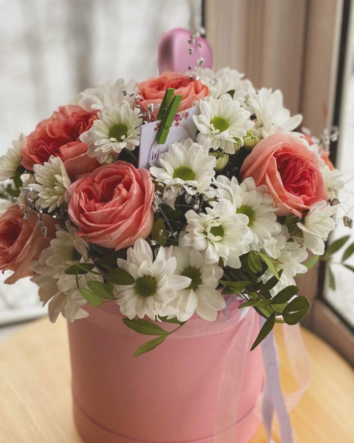 Композиция украшена сердечком на шпажке и нашей фирменной открыткой на прищепке.