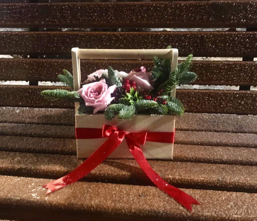 Новогодняя композиция из живого нобилиса в деревянном ящике.