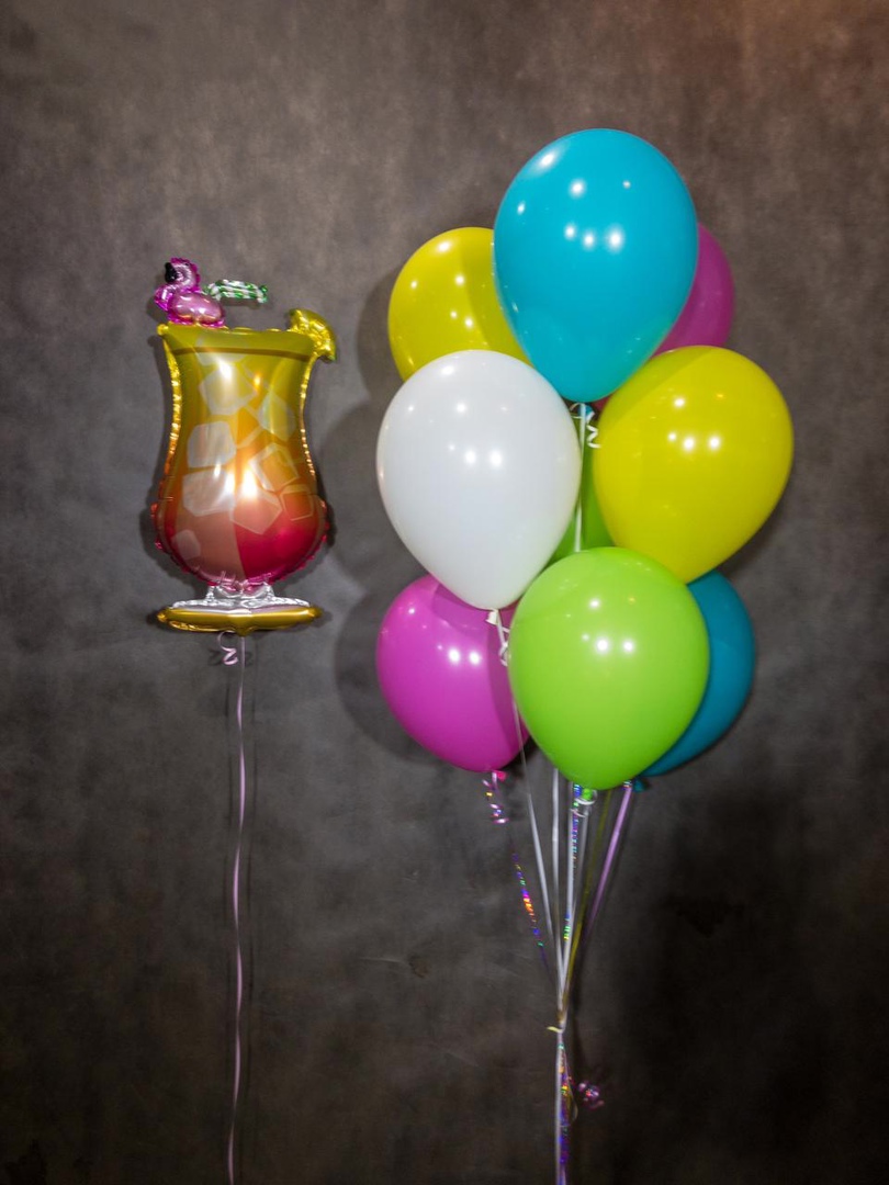 Композиция из латексных разноцветных шаров и фольгированного шара в форме тропического коктейля.