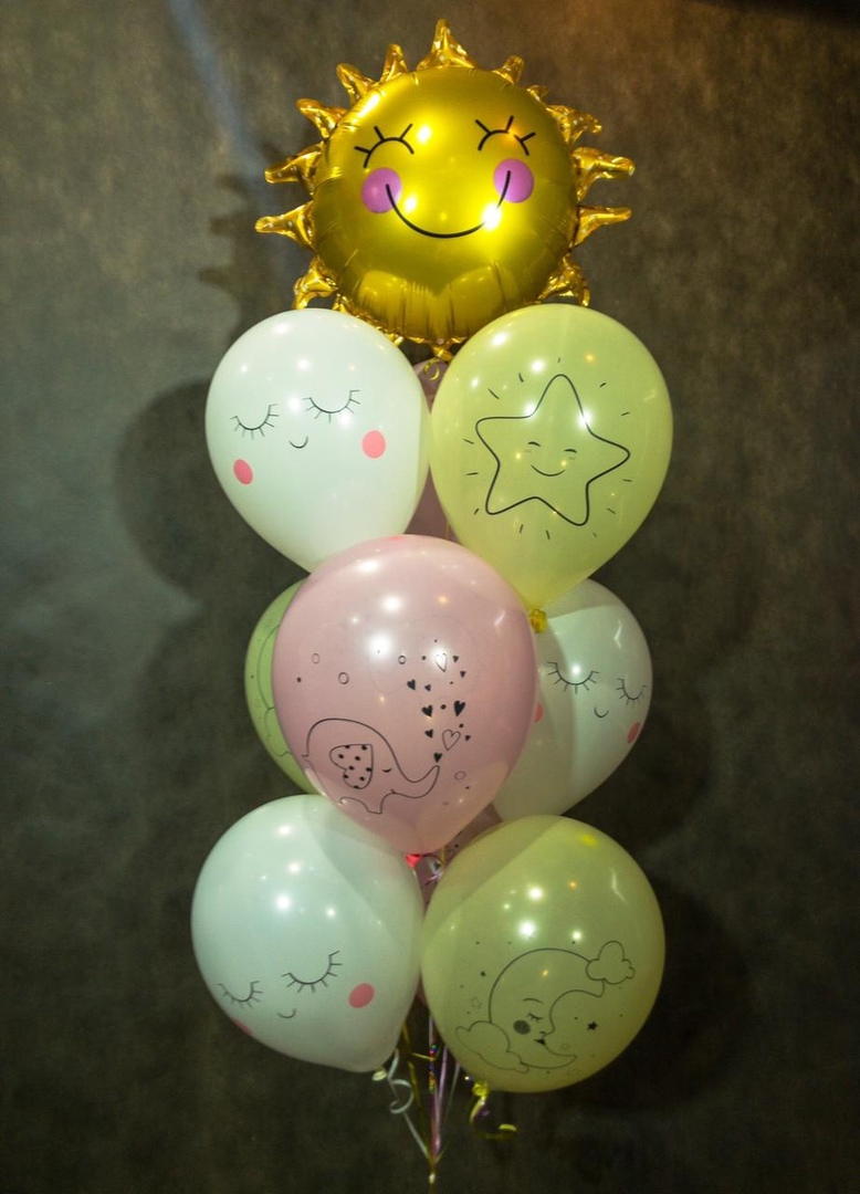 Солнечная композиция из принтованных воздушных шаров и фольгированного шара Солнце.