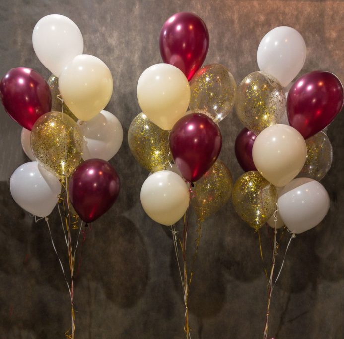 Композиция яркая и в то же время нежная из шаров цвета айвори, белого, бургундия, прозрачный с золотом.