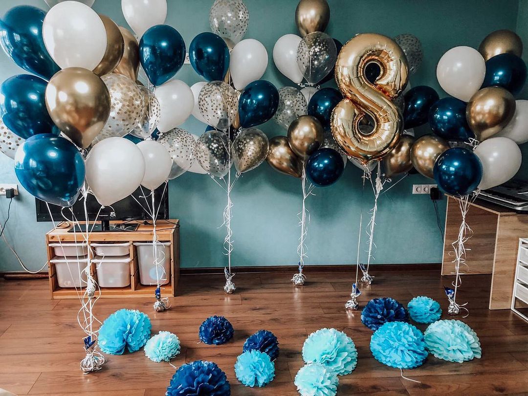 78 воздушных шаров: прозрачные с золотым конфетти, белые, хромированные синие и золотые и золотая цифра — отличный подарок на День рождения.