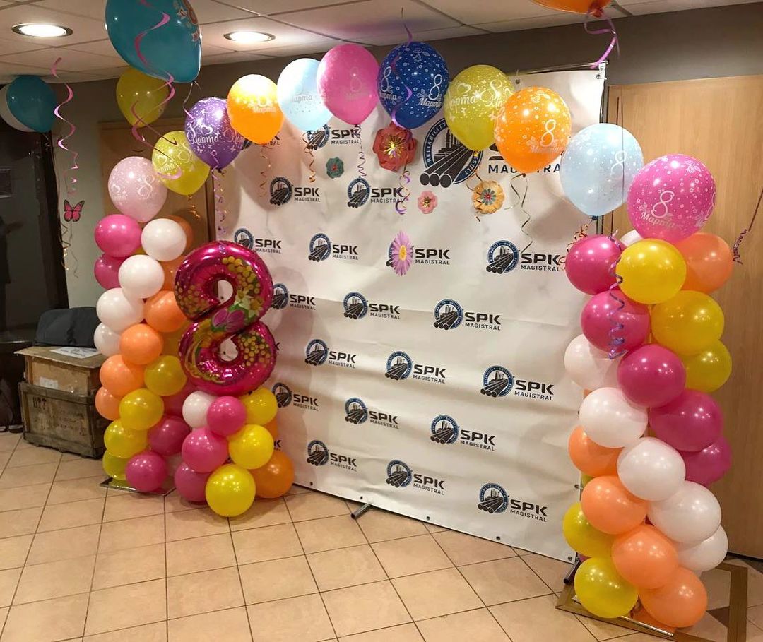 Фотозона из воздушных шаров для компании «СПК-Магистраль» выполнена из ярких и в то же время, нежных шаров и баннера с логотипом компании.