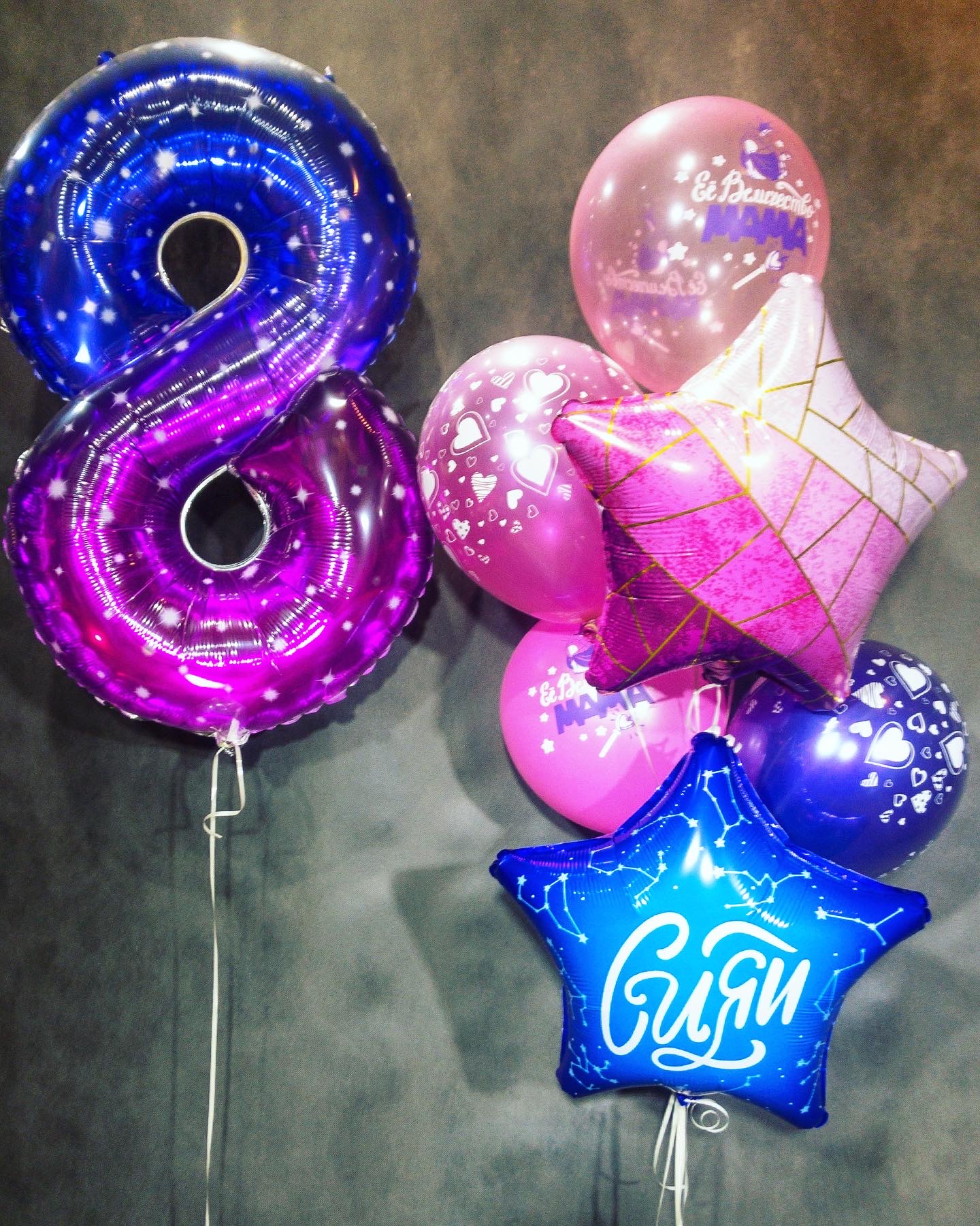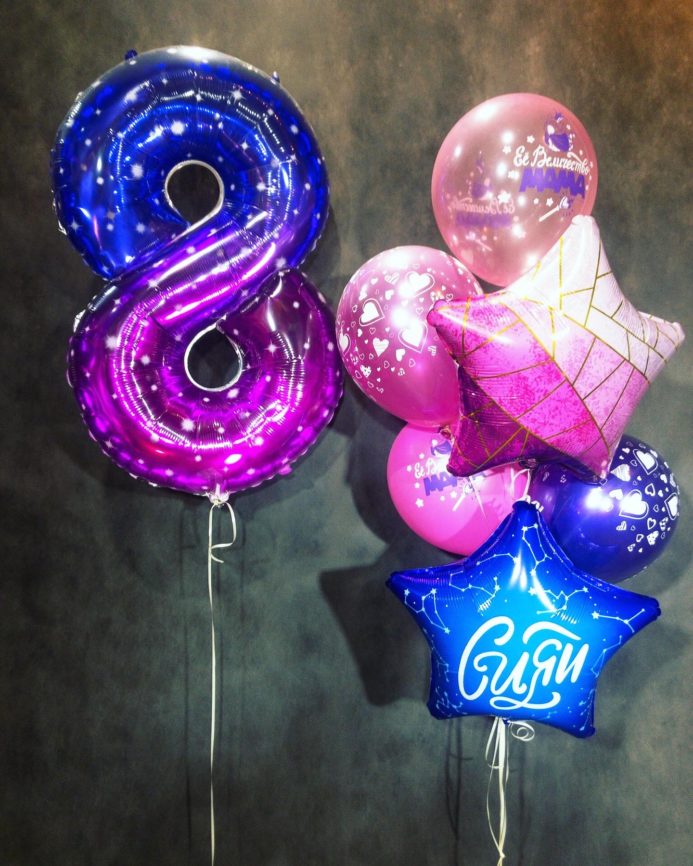 | Цвета шаров | Металлик, Розовый, Синий, Фиолетовый |