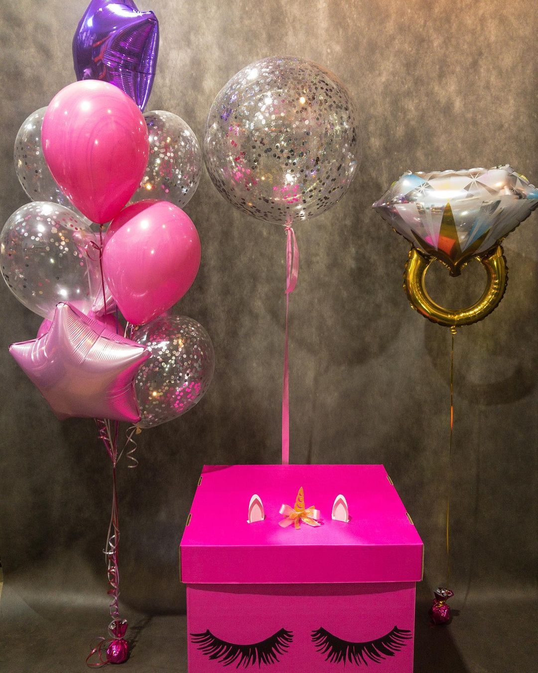Фонтан-сюрприз в розовых тонах в коробке с оригинальным декором для оформления девичника отличный элемент праздника.