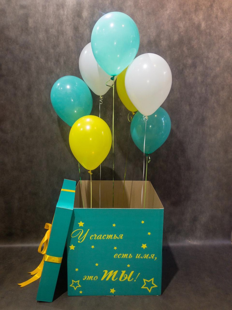 Выбирайте коробку нужного вам цвета, решайте сколько в ней будет шаров и какие они будут. Выбор коробок и шаров очень большой, на любой вкус.