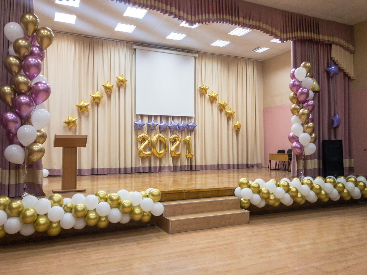 Для оформления актового зала и сцены мы использовали золотые, белые, голубые и цвета фуксии шары из хромового и классического латекса, а также фольгированные звёзды и цифры.